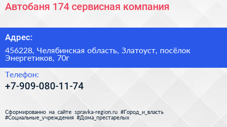 Автобаня 174, сервисная компания по адресу 456228, Челябинская область, Златоуст, посёлок Энергетиков, 70г в дальнейшем Организация, размещена в следующих категориях: