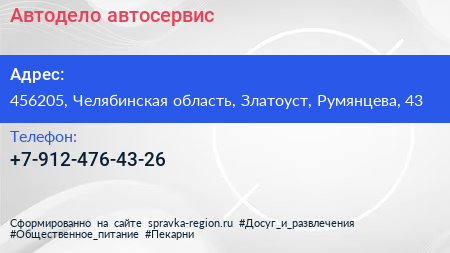 Автодело, автосервис по адресу 456205, Челябинская область, Златоуст, Румянцева, 43 в дальнейшем Организация, размещена в следующих категориях: