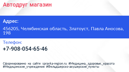 Автодруг, магазин по адресу 456205, Челябинская область, Златоуст, Павла Аносова, 198 в дальнейшем Организация, размещена в следующих категориях: