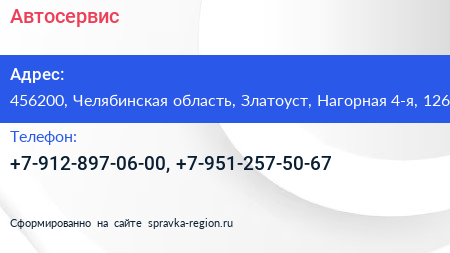 Автосервис по адресу 456200, Челябинская область, Златоуст, Нагорная 4-я, 126 в дальнейшем Организация, размещена в следующих категориях: