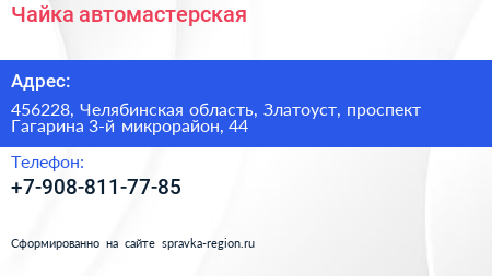Чайка, автомастерская по адресу 456228, Челябинская область, Златоуст, проспект Гагарина 3-й микрорайон, 44 в дальнейшем Организация, размещена в следующих категориях: