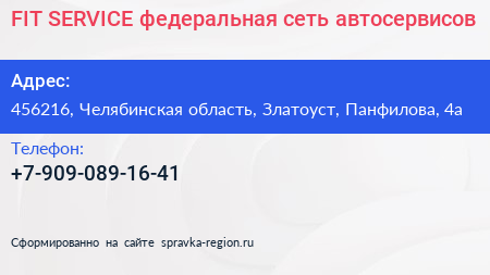 FIT SERVICE, федеральная сеть автосервисов по адресу 456216, Челябинская область, Златоуст, Панфилова, 4а в дальнейшем Организация, размещена в следующих категориях: