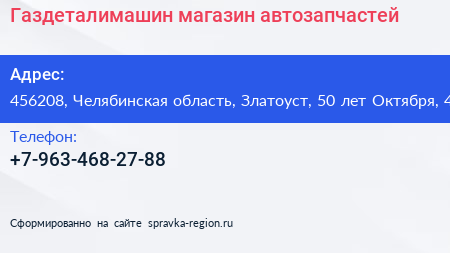 Газдеталимашин, магазин автозапчастей по адресу 456208, Челябинская область, Златоуст, 50 лет Октября, 4 в дальнейшем Организация, размещена в следующих категориях: