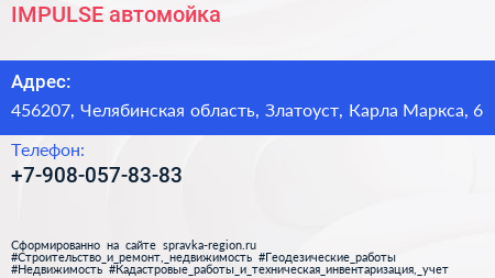 IMPULSE, автомойка по адресу 456207, Челябинская область, Златоуст, Карла Маркса, 6 в дальнейшем Организация, размещена в следующих категориях:
