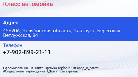 Класс, автомойка по адресу 456206, Челябинская область, Златоуст, Береговая Ветлужская, 84 в дальнейшем Организация, размещена в следующих категориях: