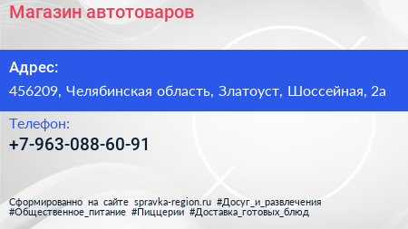 Магазин автотоваров по адресу 456209, Челябинская область, Златоуст, Шоссейная, 2а в дальнейшем Организация, размещена в следующих категориях: