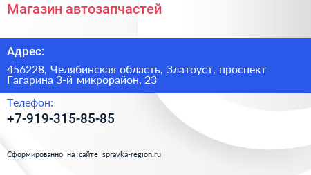 Магазин автозапчастей по адресу 456228, Челябинская область, Златоуст, проспект Гагарина 3-й микрорайон, 23 в дальнейшем Организация, размещена в следующих категориях: