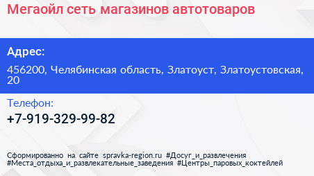 Мегаойл, сеть магазинов автотоваров по адресу 456200, Челябинская область, Златоуст, Златоустовская, 20 в дальнейшем Организация, размещена в следующих категориях: