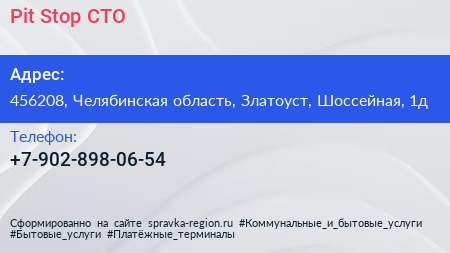 Pit Stop, СТО по адресу 456208, Челябинская область, Златоуст, Шоссейная, 1д в дальнейшем Организация, размещена в следующих категориях: