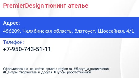 PremierDesign, тюнинг-ателье по адресу 456209, Челябинская область, Златоуст, Шоссейная, 4/1 в дальнейшем Организация, размещена в следующих категориях: