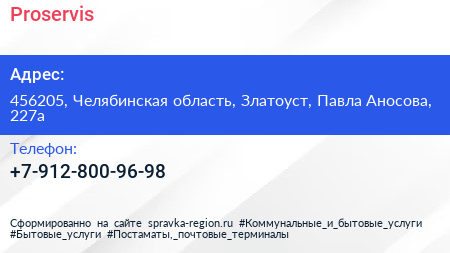 Proservis по адресу 456205, Челябинская область, Златоуст, Павла Аносова, 227а в дальнейшем Организация, размещена в следующих категориях:
