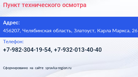 Пункт технического осмотра по адресу 456207, Челябинская область, Златоуст, Карла Маркса, 26 в дальнейшем Организация, размещена в следующих категориях: