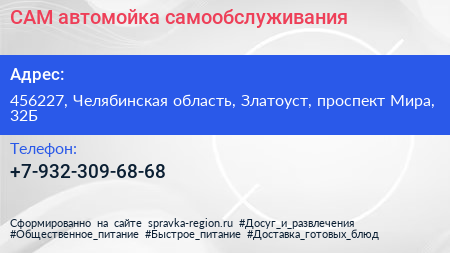 САМ, автомойка самообслуживания по адресу 456227, Челябинская область, Златоуст, проспект Мира, 32Б в дальнейшем Организация, размещена в следующих категориях: