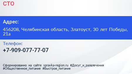 СТО по адресу 456208, Челябинская область, Златоуст, 30 лет Победы, 21а в дальнейшем Организация, размещена в следующих категориях: