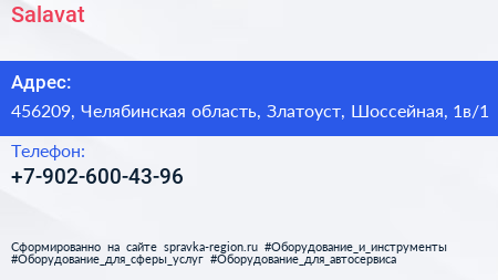 Salavat по адресу 456209, Челябинская область, Златоуст, Шоссейная, 1в/1 в дальнейшем Организация, размещена в следующих категориях: