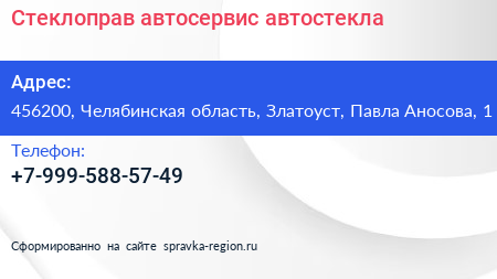 Стеклоправ, автосервис автостекла по адресу 456200, Челябинская область, Златоуст, Павла Аносова, 1 в дальнейшем Организация, размещена в следующих категориях: