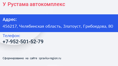 У Рустама, автокомплекс по адресу 456217, Челябинская область, Златоуст, Грибоедова, 80 в дальнейшем Организация, размещена в следующих категориях: