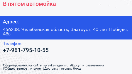 В пятом, автомойка по адресу 456238, Челябинская область, Златоуст, 40 лет Победы, 48в в дальнейшем Организация, размещена в следующих категориях: