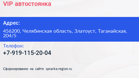 VIP, автостоянка по адресу 456200, Челябинская область, Златоуст, Таганайская, 204/5 в дальнейшем Организация, размещена в следующих категориях: