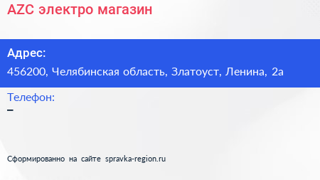 AZC электро, магазин по адресу 456200, Челябинская область, Златоуст, Ленина, 2а в дальнейшем Организация, размещена в следующих категориях: