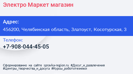 Электро Маркет, магазин по адресу 456200, Челябинская область, Златоуст, Косотурская, 3 в дальнейшем Организация, размещена в следующих категориях: