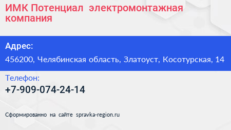 ИМК Потенциал+, электромонтажная компания по адресу 456200, Челябинская область, Златоуст, Косотурская, 14 в дальнейшем Организация, размещена в следующих категориях: