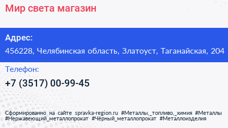 Мир света, магазин по адресу 456228, Челябинская область, Златоуст, Таганайская, 204 в дальнейшем Организация, размещена в следующих категориях: