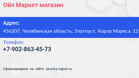 Ойл-Маркет, магазин по адресу 456207, Челябинская область, Златоуст, Карла Маркса, 12 в дальнейшем Организация, размещена в следующих категориях:
