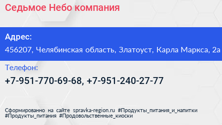 Седьмое Небо, компания по адресу 456207, Челябинская область, Златоуст, Карла Маркса, 2а в дальнейшем Организация, размещена в следующих категориях: