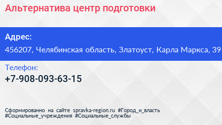 Альтернатива, центр подготовки по адресу 456207, Челябинская область, Златоуст, Карла Маркса, 39 в дальнейшем Организация, размещена в следующих категориях: