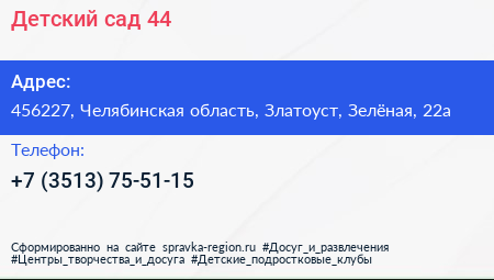 Детский сад №44 по адресу 456227, Челябинская область, Златоуст, Зелёная, 22а в дальнейшем Организация, размещена в следующих категориях: