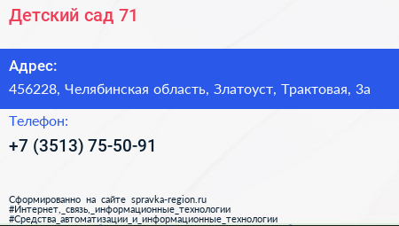 Детский сад №71 по адресу 456228, Челябинская область, Златоуст, Трактовая, 3а в дальнейшем Организация, размещена в следующих категориях: