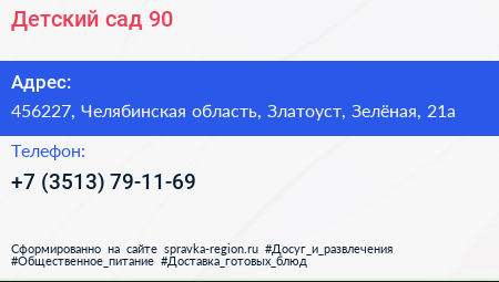 Детский сад №90 по адресу 456227, Челябинская область, Златоуст, Зелёная, 21а в дальнейшем Организация, размещена в следующих категориях: