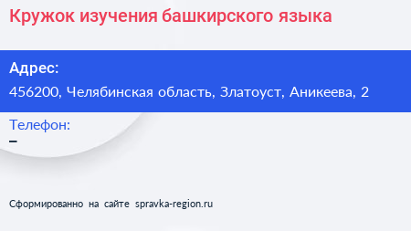 Кружок изучения башкирского языка по адресу 456200, Челябинская область, Златоуст, Аникеева, 2 в дальнейшем Организация, размещена в следующих категориях: