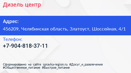 Дизель-центр по адресу 456209, Челябинская область, Златоуст, Шоссейная, 4/1 в дальнейшем Организация, размещена в следующих категориях: