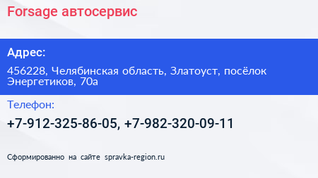 Forsage, автосервис по адресу 456228, Челябинская область, Златоуст, посёлок Энергетиков, 70а в дальнейшем Организация, размещена в следующих категориях: