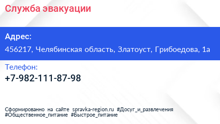 Служба эвакуации по адресу 456217, Челябинская область, Златоуст, Грибоедова, 1а в дальнейшем Организация, размещена в следующих категориях: