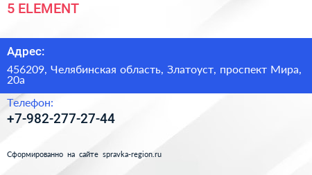 5 ELEMENT по адресу 456209, Челябинская область, Златоуст, проспект Мира, 20а в дальнейшем Организация, размещена в следующих категориях: