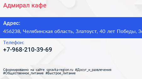 Адмирал, кафе по адресу 456238, Челябинская область, Златоуст, 40 лет Победы, 36 в дальнейшем Организация, размещена в следующих категориях: