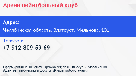 Арена, пейнтбольный клуб по адресу Челябинская область, Златоуст, Мельнова, 101 в дальнейшем Организация, размещена в следующих категориях: