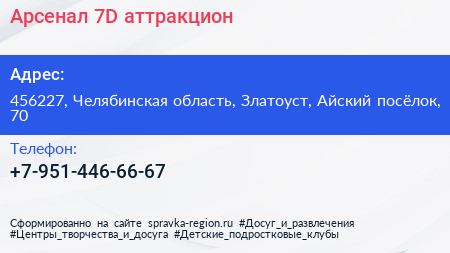 Арсенал, 7D-аттракцион по адресу 456227, Челябинская область, Златоуст, Айский посёлок, 70 в дальнейшем Организация, размещена в следующих категориях: