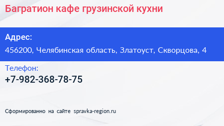Багратион, кафе грузинской кухни по адресу 456200, Челябинская область, Златоуст, Скворцова, 4 в дальнейшем Организация, размещена в следующих категориях: