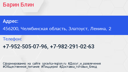 Барин Блин по адресу 456200, Челябинская область, Златоуст, Ленина, 2 в дальнейшем Организация, размещена в следующих категориях: