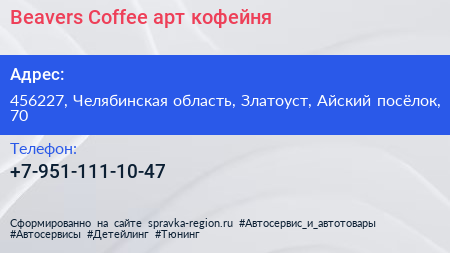 Beavers Coffee, арт-кофейня по адресу 456227, Челябинская область, Златоуст, Айский посёлок, 70 в дальнейшем Организация, размещена в следующих категориях: