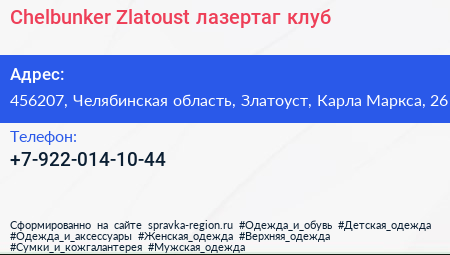 Chelbunker Zlatoust, лазертаг-клуб по адресу 456207, Челябинская область, Златоуст, Карла Маркса, 26 в дальнейшем Организация, размещена в следующих категориях: