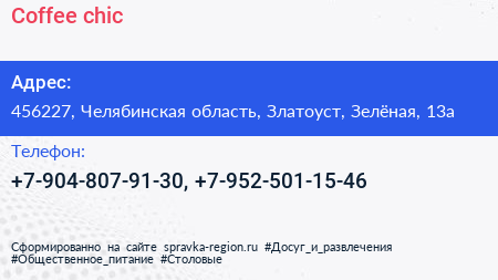 Coffee-chic по адресу 456227, Челябинская область, Златоуст, Зелёная, 13а в дальнейшем Организация, размещена в следующих категориях: