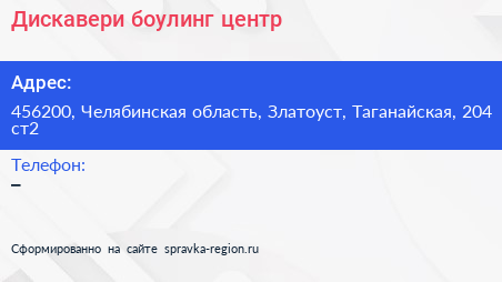 Дискавери, боулинг-центр по адресу 456200, Челябинская область, Златоуст, Таганайская, 204 ст2 в дальнейшем Организация, размещена в следующих категориях: