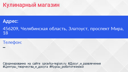 Кулинарный, магазин по адресу 456209, Челябинская область, Златоуст, проспект Мира, 18 в дальнейшем Организация, размещена в следующих категориях: