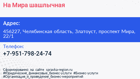 На Мира, шашлычная по адресу 456227, Челябинская область, Златоуст, проспект Мира, 22/1 в дальнейшем Организация, размещена в следующих категориях: