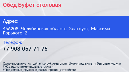 Обед-Буфет, столовая по адресу 456208, Челябинская область, Златоуст, Максима Горького, 2 в дальнейшем Организация, размещена в следующих категориях: